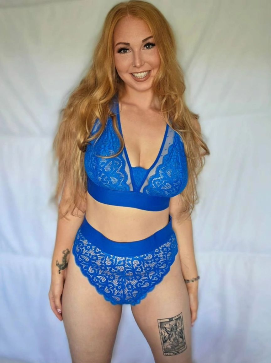 Woman wearing a blue lace bralette against a plain background