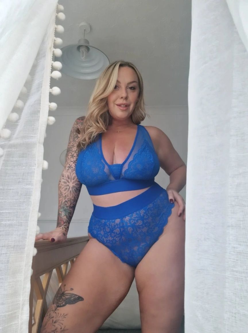 Woman wearing a blue lace lingerie set on a plain background