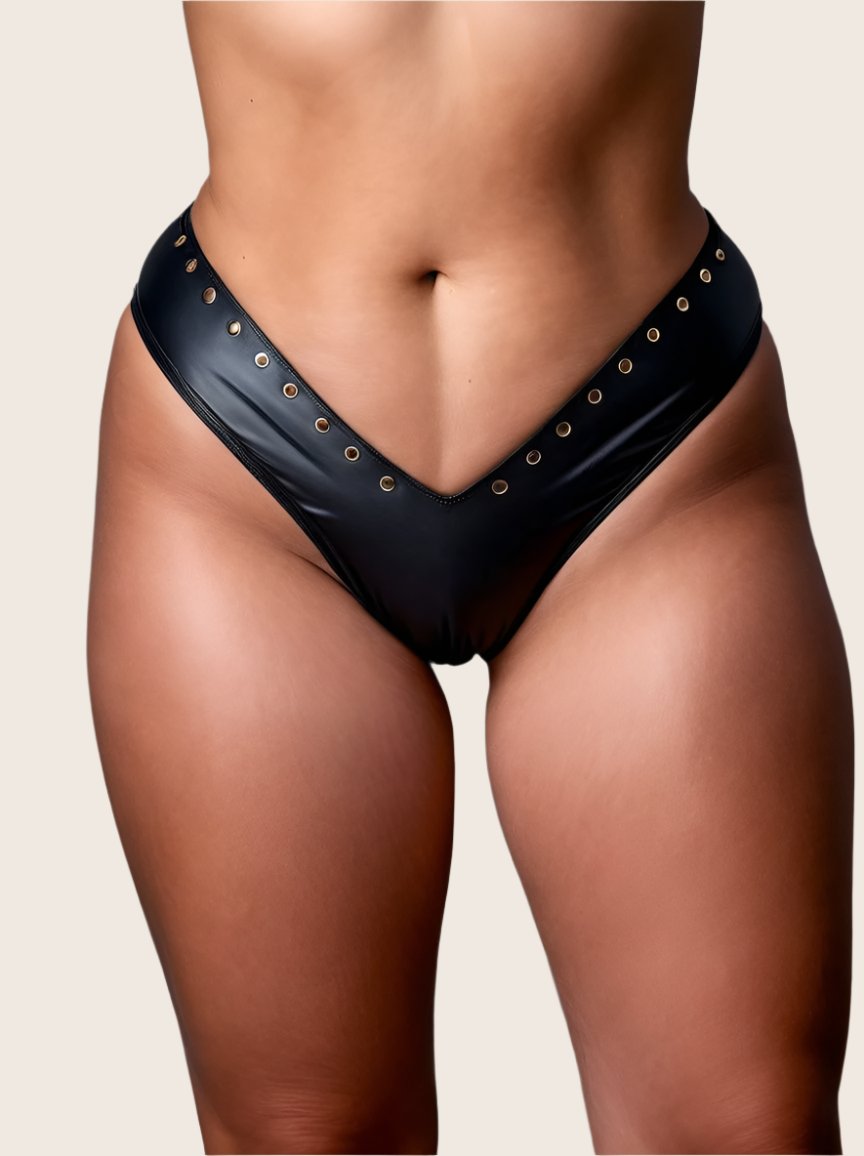 Become their ultimate desire with the Torment knicker in Obsidian Black. This cheeky Brazilian piece features a provocative deep V front decorated with eyelets and striking gold hardware. The high, revealing waistband accentuates your hips, while the wild, wet-look finish adds fierce allure. Designed for quick slip-on and off, it guarantees they’ll keep coming back for more.